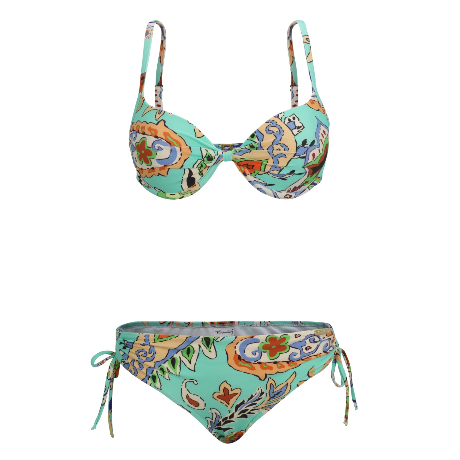 Der Bikini aus der Serie „Minty Mind“ mit seitlich gerafftem Höschen, mit Raffung am Oberteil bekommt durch den Paisley Print in Trendfarben seine Daseinsberechtigung. Perfekt aufeinander abgestimmt sind Schnittführung und Farbauswahl.