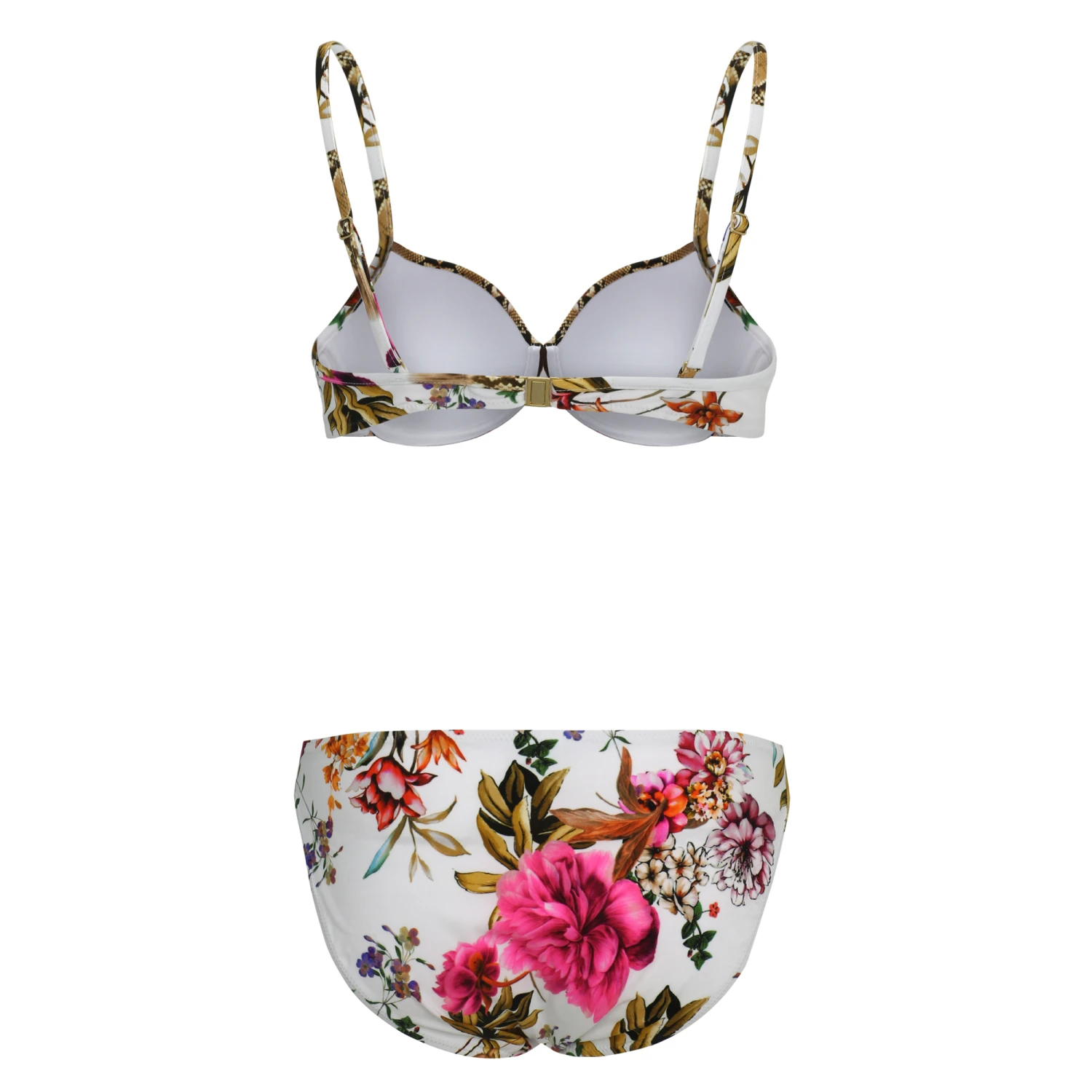 Der Bikini mit Schale und Bügel aus der Serie „Sunset Bay“ verspricht mit den Trends aus F/S21 ein Must-Have zu werden. Der zeitlose Schnitt wird durch den Snake-Print und den Flower-Trend in Szene gesetzt.
